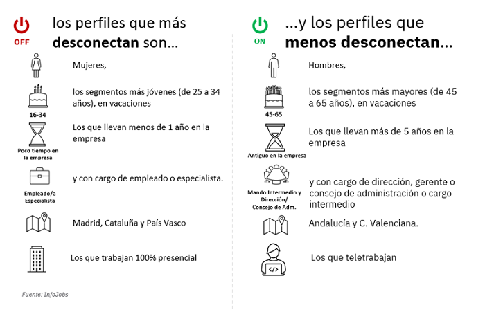 Si se tuviese que personificar la falta de desconexión digital, los datos del estudio de InfoJobs dibujan el perfil de un hombre de entre 45 y 65 años, que lleva más de 5 años en la empresa y con un cargo de responsabilidad (dirección, gerencia o consejo de administración o cargo intermedio) y teletrabaja. En contraposición, el perfil del profesional que más consigue desconectar es el de una mujer joven (de 25 a 34 años), que cuenta con menos de 1 año de antigüedad, tiene un cargo de empleada o especialista y trabaja de forma presencial.