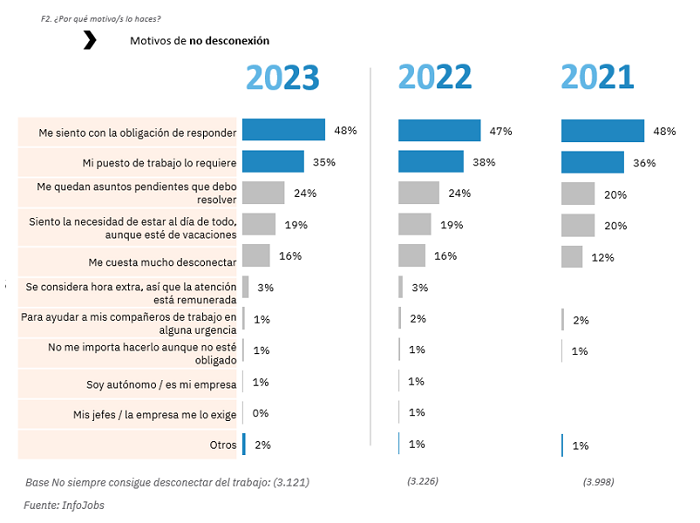 En lo que se refiere a los motivos y resultados que indican los trabajadores para responder correos y llamadas fuera del horario, no existen cambios significativos respecto a años anteriores: el 48% señala que no desconecta, porque se siente en la obligación de responder. A esta razón le siguen, en segunda y en tercera posición, el requerimiento del puesto de trabajo en cuestión (35% frente al 38% de 2022) y la finalización de asuntos pendientes por resolver (24%, idéntico porcentaje que el año pasado).