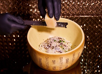En Inclán Brutal Bar podrás deleitar tu exigente paladar con un trampantojo cremoso con trufa de temporada. Un falso risotto mantecado con salsa de chalotas, queso ahumado de oveja y trufa fresca rallada, servido en un queso gigante.