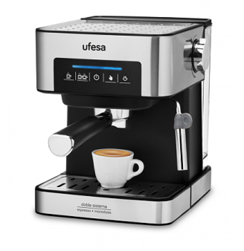 La cafetera de Ufesa cuenta con un depósito de agua extraíble de 1,6 l., incluye vaporizador orientable con protección para que pueda usarse para espumar leche, calentar agua para infusiones o calentar todo tipo de líquidos.