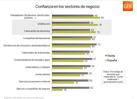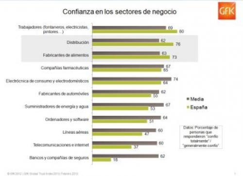 Las empresas de distribución con un 76% y los fabricantes de alimentos con un 73% son dos de los sectores de actividad que cuentan con una mayor confianza por parte de los españoles. En el informe GfK Trust Index 2013 estas compañías sólo son superadas por el personal de oficios (electricistas, carpinteros, fontaneros y pintores) con un 80%.