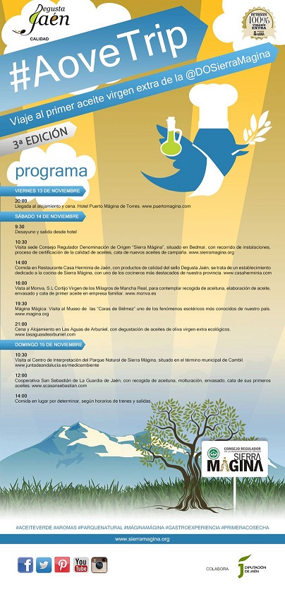 Los aceites elaborados a partir de las primeras aceitunas recolectadas durante los meses de octubre y noviembre serán los protagonistas indiscutibles del evento denominado #AoveTripIII, que por tener año consecutivo celebra este fin de semana la Denominación de Origen Sierra Mágina (Jaén) en colaboración con la iniciativa ‘Degusta Jaén’ de la Diputación de Jaén, para dar a conocer el carácter y personalidad de estos caldos ‘tempranos’, así como su enorme potencial en la cocina.