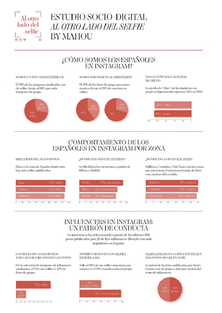 “Al otro lado del selfie” apunta que las fotos que se publican en Instagram en grupo cuentan con una media de likes ligeramente superior a las individuales o selfies. Además, las situaciones que más felices nos hacen a los españoles son las vacaciones, el 59% de las imágenes con este hashtag presentan sonrisas, el ocio nocturno (58%) y acudir a bares y restaurantes (53%).