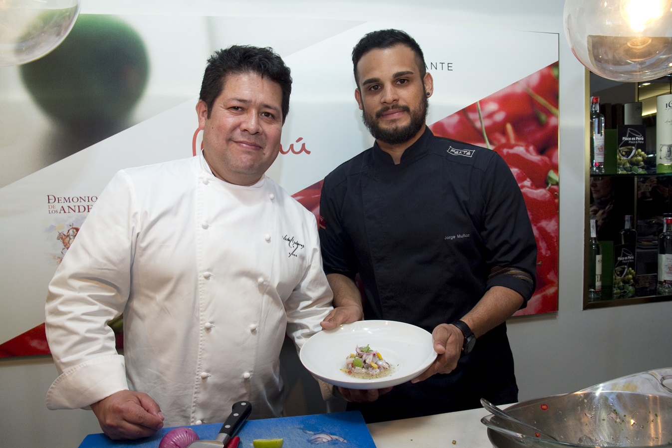 El prestigioso cocinero peruano Víctor Gutiérrez, que cuenta con una estrella Michelin, ha diseñado el menú de los restaurantes de El Corte Inglés, además de organizar distintas demostraciones de cocina y talleres sobre la gastronomía de su país. En la presentación, ha estado acompañado de Jorge Muñoz, chef del restaurante Pakta, también con estrella Michelin. Al acto, que ha tenido lugar en el restaurante de El Corte Inglés de Serrano, han asistido Javier Cerro, director de Compras de Hostelería de El Corte Inglés, Félix Arturo Chipoco, Cónsul General del Perú en Madrid, Willy Salazar, responsable de Asuntos Culturales y Turismo de la Embajada de Perú, Bernardo Muñoz, consejero Económico Comercial de la Embajada de Perú, Fernando Tomás, director de Comunicación y Promoción de Viajes El Corte Inglés, así como los dos chefs de reconocido prestigio, Víctor Gutiérrez y Jorge Muñoz, ambos con una estrella Michelin. Durante la presentación los cocineros han elaborado un cebiche con cebollitas rojas que posteriormente los asistentes al acto han podido degustar junto a la bebida peruana por excelencia, el pisco. Además, en la presentación, los asistentes han podido probar también la cerveza popular de Perú y fruta originaria del país.