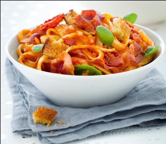 7. Cocer la pasta en agua hirviendo según las instrucciones del paquete y añadir el concentrado de tomate con un poco del agua de cocción, añadir las espinacas y remover, uniéndolo a la panceta, los picatostes y los tomates deshidratados.