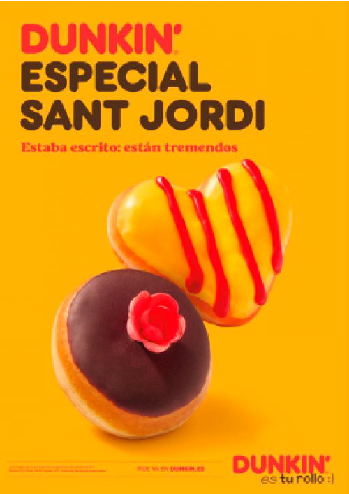 Bajo el claim “Estaba escrito: están tremendos”, Dunkin’ presenta “Dunkin’ Senyera”, una concha con forma de corazón, rellena de choco avellana y decorado con icing de vainilla, haciendo un guiño a los colores de la bandera catalana, y “Dunkin’ Rosa de Sant Jordi”, cubierto con icing de chocolate, relleno de crema pastelera y decorado con la clásica rosa roja tan típica de esta celebración.