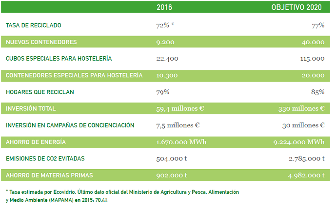 La tasa de reciclado de vidrio en 2016, del 72%[1], se sitúa a tan solo cinco puntos del objetivo del 77% previsto en el Plan Horizonte 2020. Esta cifra supera con cinco años de antelación el objetivo europeo de reciclar el 75% en el 2025. Para conseguirlo, el Plan Estratégico prevé una inversión de 300 millones hasta 2020. Solo en 2016, la entidad destinó casi 60 millones de euros en inversiones para distintas iniciativas, con un especial foco en la hostelería y la sensibilización ciudadana.