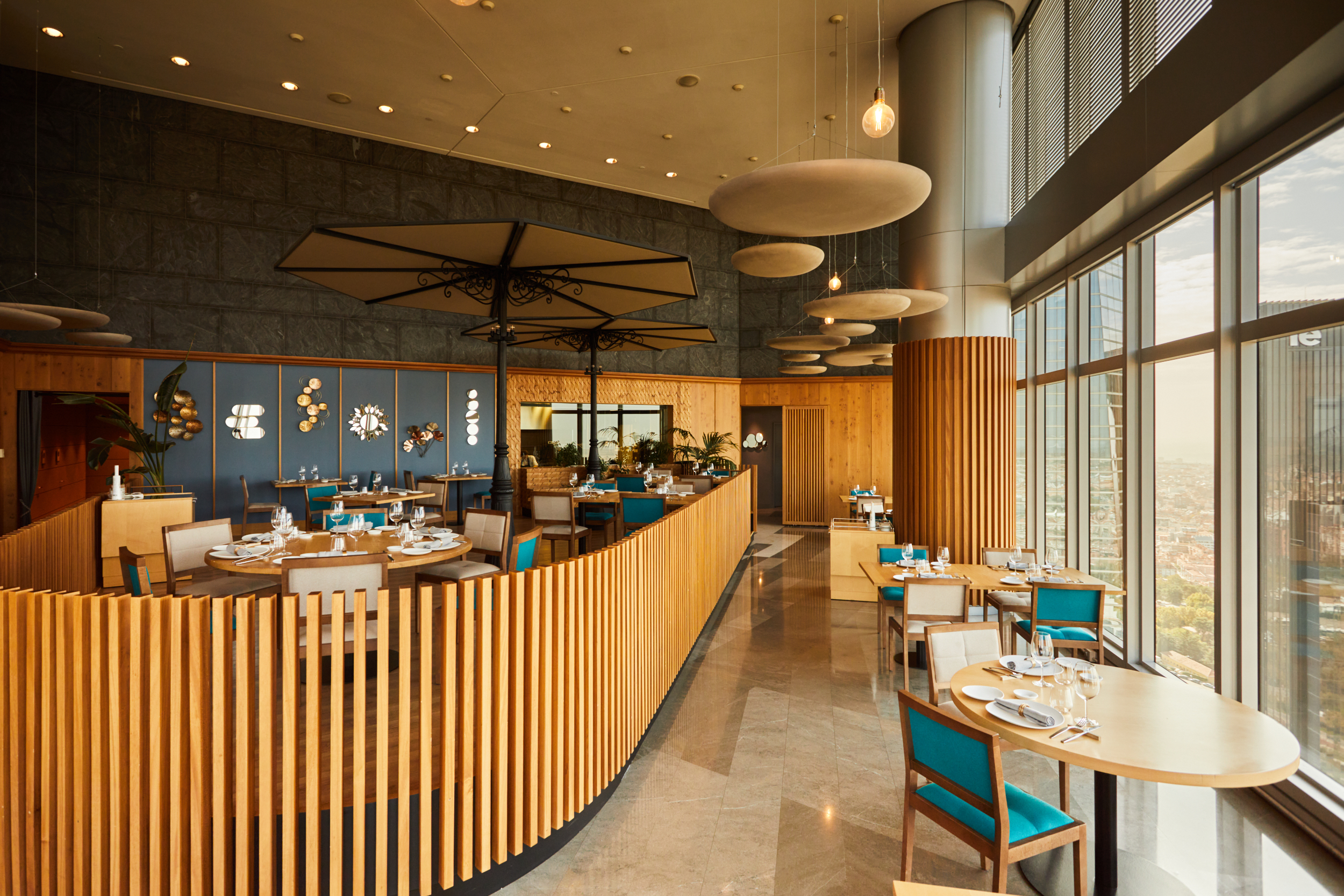 El restaurante fusiona tradición mediterránea y técnica de vanguardia en su carta estacional; la experiencia se complementa con sus versátiles espacios modulables y el ambiente nocturno de Élkar Club