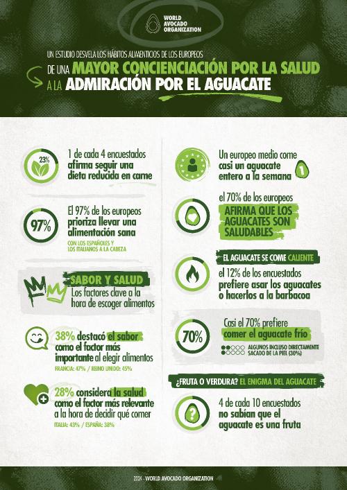 Una encuesta detallada, realizada para la Organización Mundial del Aguacate, llevada a cabo en cinco países europeos (Reino Unido, Francia, Alemania, Italia y España) ha revelado datos sorprendentes sobre la mentalidad de los europeos respecto a su salud, sus dietas y su estilo de vida. Esta información es especialmente relevante, teniendo en cuenta que los índices de obesidad van en aumento y que en 2035 se estima que más de la mitad de la población mundial padecerá de sobrepeso u obesidad. De hecho, los resultados de la encuesta subrayan la importancia que la gente atribuye actualmente a una alimentación saludable, ya que el 97% de los encuestados expresó la importancia de mantener una dieta sana. El 23% afirma que es "ligeramente importante", el 49% que es "importante" y el 25% que es "extremadamente importante". Los españoles encabezan la lista, con un 99% de los encuestados manifestando su preocupación por mantener una dieta saludable. Sin embargo, los alemanes se muestran en comparación menos preocupados, con un 5% que no le da importancia alguna.