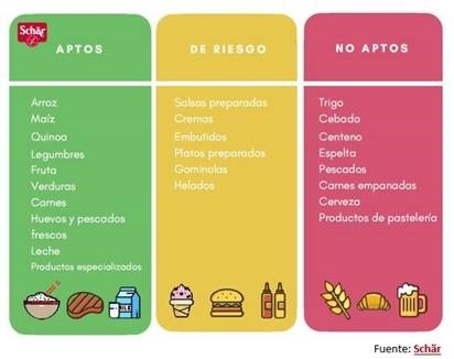 El gluten es una proteína que está presente en alimentos de uso cotidiano como el trigo, el centeno o la espelta. Al ingerirlos, pueden provocar una reacción inmunológica en el intestino con síntomas como dolor de cabeza, cansancio, pérdida de peso, diarrea, dolor abdominal, vientre hinchado o náuseas. Es entonces cuando aparece la enfermedad celiaca, este trastorno relacionado con el gluten que afecta al 1% de la población mundial. Solo en España se estima que hay 450.000 personas celíacas y son el doble de mujeres afectadas que hombres. El único tratamiento posible es la dieta sin gluten estricta y permanente. Por ello, existen otros muchos alimentos aptos para que una persona que padece la enfermedad celíaca, pueda llevar una alimentación completa y rica en nutrientes. Schär, la marca líder en productos sin gluten, incorpora muchos de estos alimentos en sus productos. A continuación, te mostramos una clasificación de alimentos aptos, de riesgo, y no aptos para hacer más fácil tu elección.