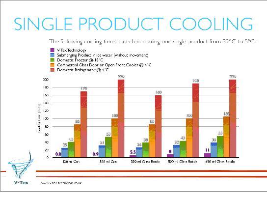 RapidCool está enfocado a enfriar pequeñas cantidades bajo demanda, suprimiendo la necesidad de tener grandes neveras funcionando continuamente para poder ofrecer bebidas frías durante las horas de apertura de los establecimientos. Para enfriar la bebida lo más rápidamente posible sin que se congelen las capas superficiales antes de que se enfríen las de dentro, la bebida debe estar correctamente mezclada. Por eso, la clave del éxito de la tecnología patentada V-Tex de RapidCool es la forma en que la bebida se agita sin que burbujee al abrirse.