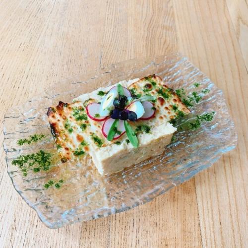 En un plato colocaremos un molde cuadrado, rellenaremos con 250GR de ensaladilla y desmoldamos. Para la presentación final pondremos una lámina de pan de aceite encima, 3 medios huevos de codorniz cocidos junto con 2 láminas de rabanito encima del pan. Terminaremos con una rama pequeña de eneldo y una línea de aceite verde y tendremos nuestra ensaladilla ¡lista para disfrutar!