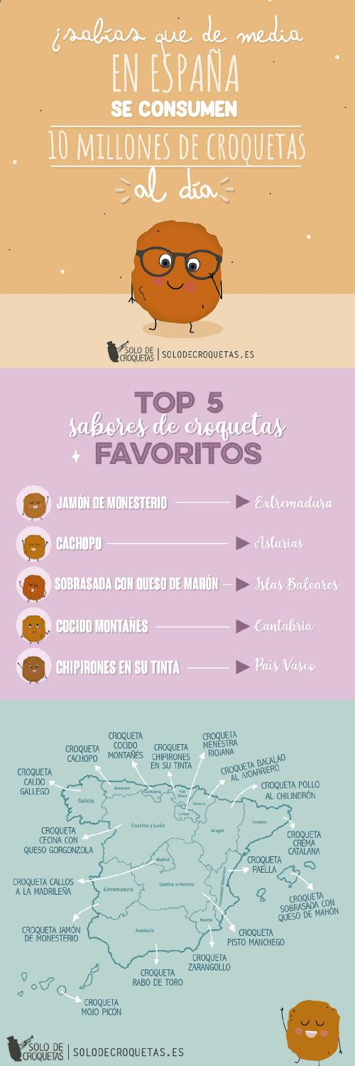 Cada año los españoles consumen más de 3.700 millones de croquetas, lo que supone 2’5 kg de croquetas por persona y año El RANKING de preferencias de croquetas según el sabor de cada comunidad autónoma está encabezado por la croqueta extremeña de jamón de Monesterio, seguida de la croqueta asturiana de cachopo y en tercer lugar la balear de sobrasada con queso de Mahón