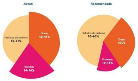 Según la Encuesta Nacional de Ingesta Dietética (ENIDE) realizada por la Agencia Española de Seguridad Alimentaria y Nutrición (AESAN), el perfil calórico global de la población española muestra un índice de proteínas de un 17%-18% y un porcentaje de grasas del 42%, ambos por encima de los valores recomendados. En el caso de las proteínas, el porcentaje recomendado oscila entre el 10% - 15%. En el caso de las grasas, debe ser menos del 35%.