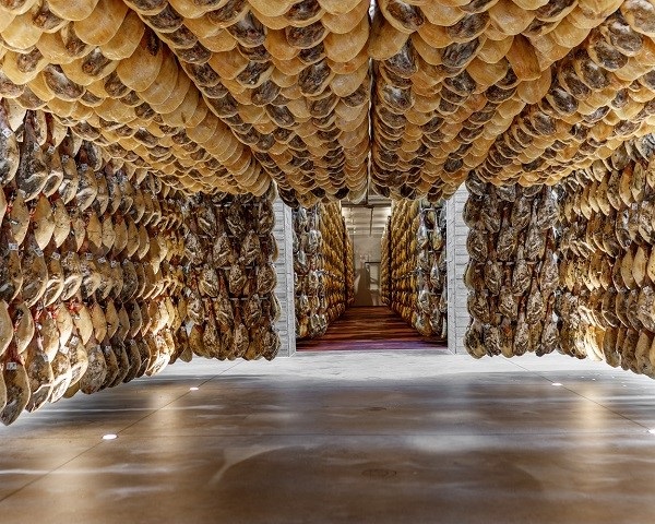 La visita finaliza con la oportunidad irrepetible de realizar una degustación en un lugar único en el mundo: la NAOS del Campus del Jamón, una bodega natural con miles de jamones que literalmente rodean al visitante.