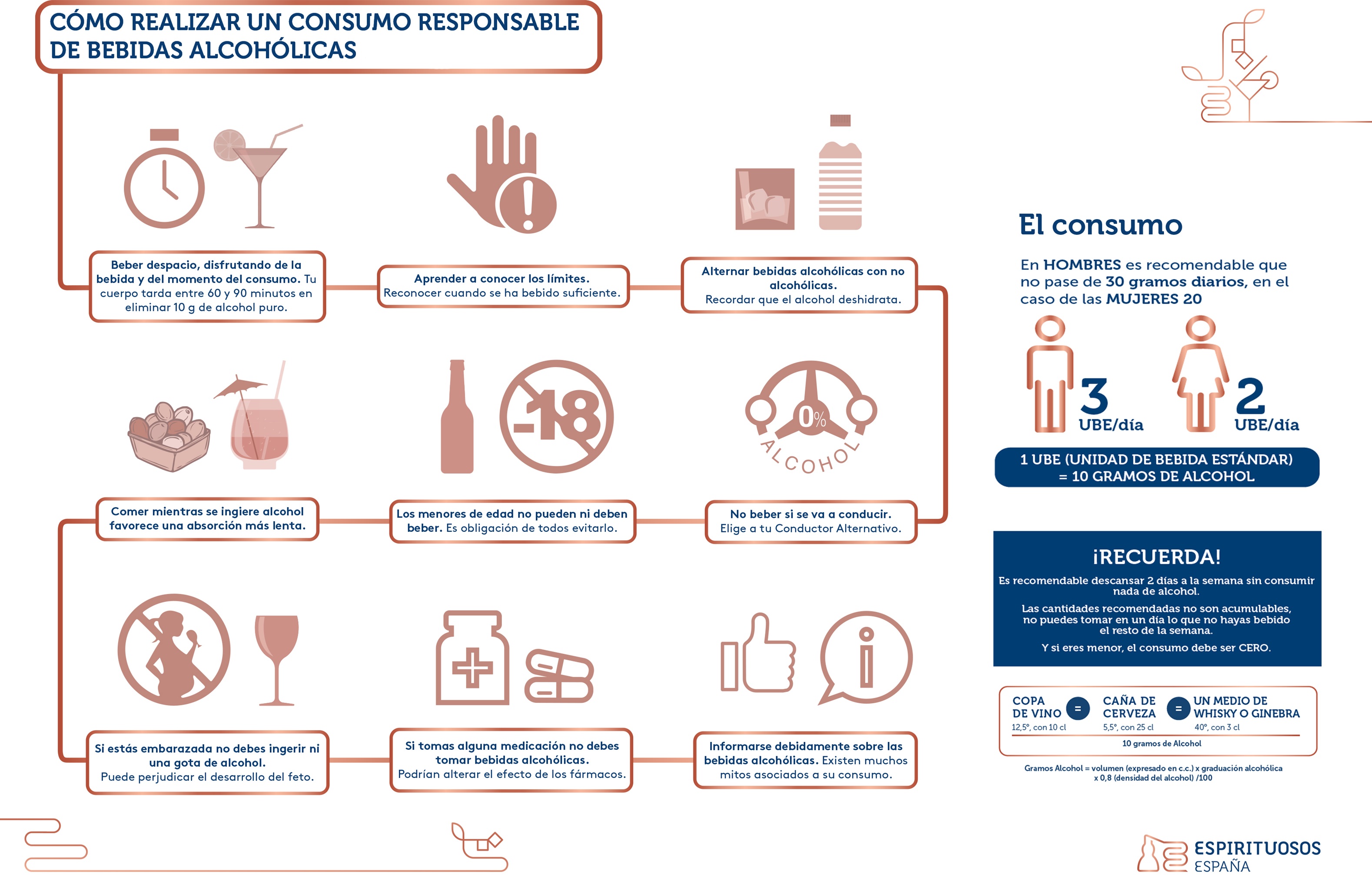 Con el objetivo de fomentar un disfrute seguro y consciente, Espirituosos España comparte algunas pautas básicas que ayudan a reducir riesgos y a vivir las celebraciones de forma más responsable:
