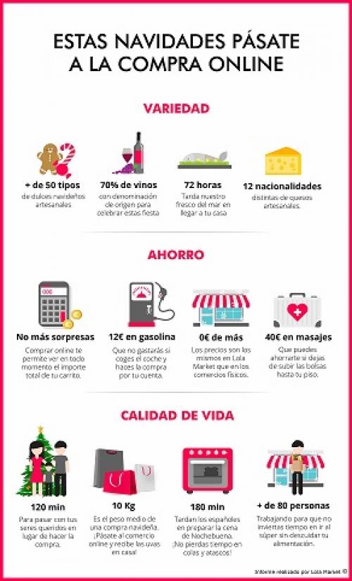 • La cesta navideña en España asciende a 235€, según el informe “Tendencias de consumo en Navidad” elaborado por la consultora TNS • La compra semanal online es la opción idónea para evitar las colas, los atascos navideños ¡y el estrés! • Lola Market ofrece en Navidad más de 50 tipos de dulces navideños, quesos artesanos de 12 nacionalidades diferentes y un 80% de vinos con denominación de origen • Además, es posible combinar en una misma compra productos de diferentes establecimientos: mercados tradicionales, hipermercados, fruterías…