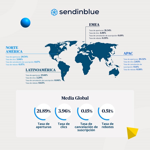 Además, esta herramienta proporciona a las empresas información y datos valiosos sobre sus suscriptores. A través de ella, las empresas pueden realizar un seguimiento de las tasas de apertura, las tasas de clics y otras métricas que les ayudan a medir el éxito de sus campañas y tomar decisiones basadas en datos para futuros esfuerzos de marketing. A continuación, Sendinblue comparte estadísticas clave a partir de un estudio sobre el rendimiento del emailing según cada industria.