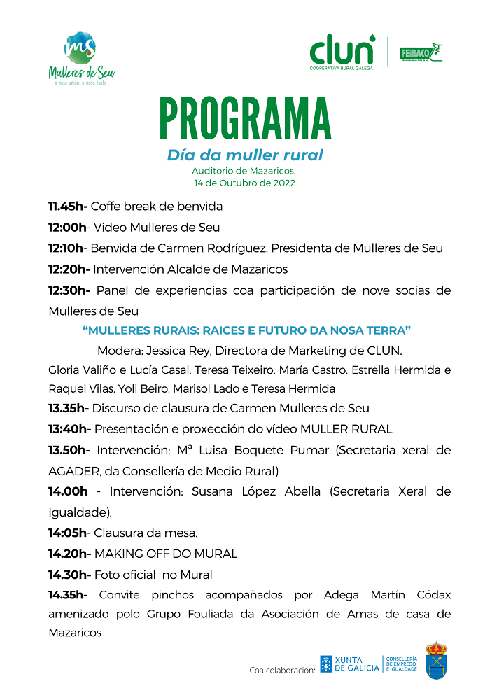 La asociación Mulleres de Seu, impulsada por la cooperativa rural CLUN, y la emblemática marca de leche FEIRACO celebran el Día Internacional de las Mujeres Rurales el viernes 14 de octubre con actos conmemorativos en el concello de Mazaricos.