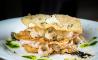 Solomillo de vacuno con salsa de boletus y guarnición de pastel de boniato, calabacín y patata