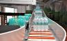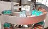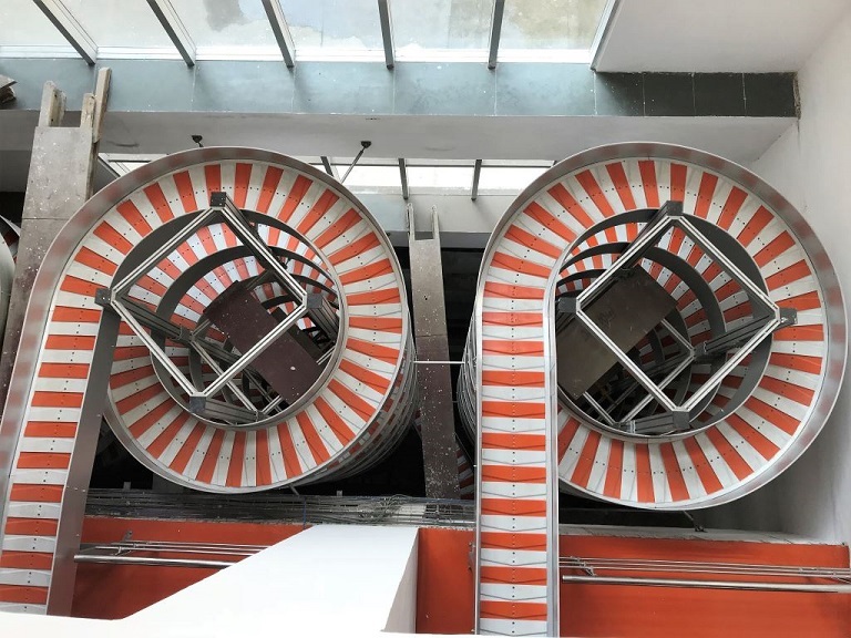 De esta tecnología de transporte, llaman la atención las tres espirales por donde circulan las botellas, y que ocupan un espacio muy reducido. La primera de ellas forma parte de la sección más larga del transportador y alcanza una altura récord de 20 metros. Esta se encarga de transportar packs retractilados de botellas fabricadas con PET de distintas capacidades (250 ml × 24 botellas, 250 ml × 48 botellas, 500 ml × 24 botellas, 1000 ml × 12 botellas, 2000 ml × 9 botellas) por cinco alturas hacia el segundo nivel por debajo de la planta baja, el área de almacén y de expedición. Las otras dos espirales, de 11 y 6 metros de altura respectivamente, forman un par de cintas transportadoras de una segunda y más corta línea, destinada exclusivamente al transporte de garrafas de agua de 5 a 20 litros de capacidad. Después del proceso de llenado, bajan en vertical por la segunda espiral hasta el primer nivel por debajo de la planta baja. Por su parte, en la tercera espiral se trasportan las garrafas vacías desde el área de limpieza, en la planta baja, hasta las máquinas de enjuague y llenado, en la primera planta de la instalación.