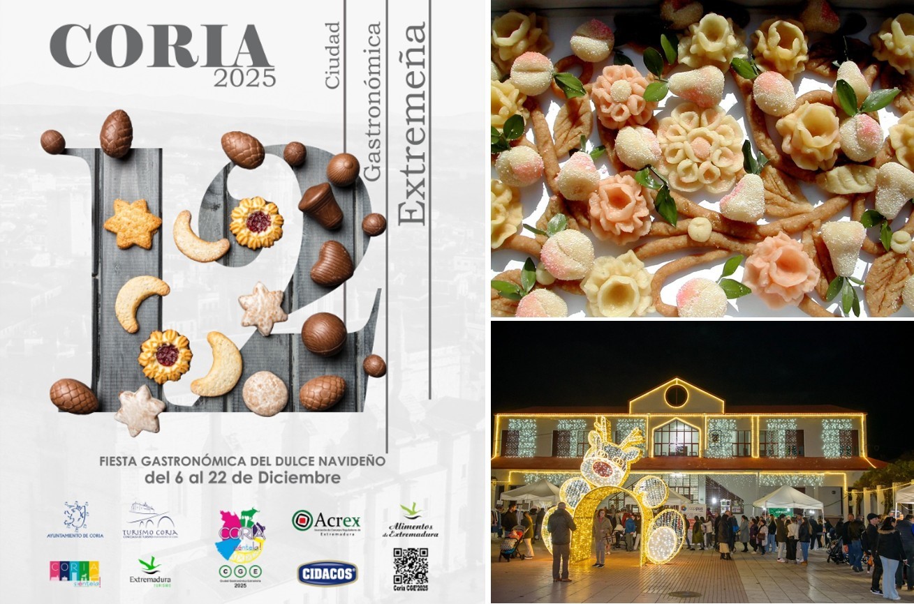 Una Fiesta Gastronómica del Dulce Navideño que enmarca otra de las muchas actividades de las que poder disfrutar en la Ciudad de Coria estas navidades, donde no hay que olvidar la IV Edición de ‘Coria en Dulce’, del 6 al 31 de diciembre, en el que las mejores pastelerías y restaurantes locales se unirán para presentar sus propuestas más deliciosas, desde una selección de elaboraciones de pasteles tradicionales navideños, hasta las creaciones de vanguardia más exquisitas. Una iniciativa que pone en valor el talento gastronómico del municipio contribuyendo a mantener vivo el espíritu navideño en nuestros hogares y en la propia Ciudad de Coria. Inclusive, dentro de este marco se celebrará un nuevo Taller de Dulces Navideños dirigido a niños entre 5 y 12 años en tres turnos, que tendrá lugar el festivo Día de la Constitución, 6 de diciembre, bajo los soportales del Ayuntamiento de Coria, como una actividad pensada para fomentar la creatividad, la tradición repostera navideña y la participación familiar, siendo imprescindible la inscripción previa de participantes en la Oficina de Turismo.