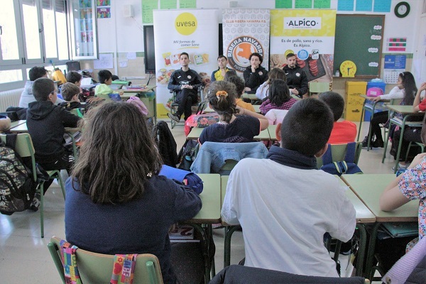 Desde el pasado mes de marzo, una delegación de jugadores de Primera División del Ribera Navarra FS y miembros de su equipo técnico han visitado une decena de centros educativos de Tudela y la Ribera ofreciendo a los alumnos una charla de presentación del Club, de su alianza con Grupo Uvesa y su marca Alpico y de la importancia de tener una alimentación saludable y de practicar algún deporte.