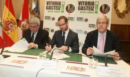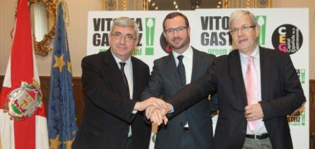 El Alcalde de Vitoria-Gasteiz, Javier Maroto, ha firmado el convenio que establece los contenidos y las contraprestaciones de las que disfrutará la ciudad como Capital de la Gastronomía 2014. Este acuerdo ha sido firmado con la entidad Capital Española de la Gastronomía, formada por la Federación Española de Hostelería (FEHR), de la mano de su presidente, Jose María Rubio y por la Federación Española de Periodistas y Escritores de Turismo (FEPET), de la mano de su presidente Mariano Palacín y establece también las obligaciones de Vitoria-Gasteiz para la correcta promoción de la marca.