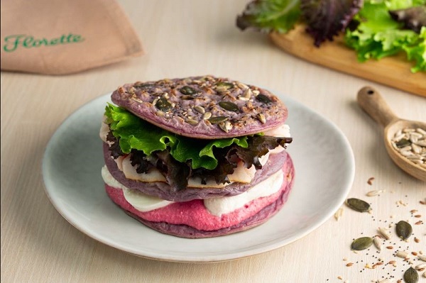 Sandwich de tortitas de patata morada con pavo, mozzarella y brotes tiernos Florette