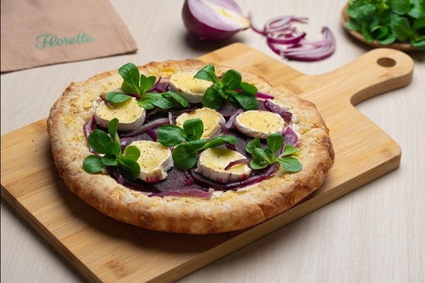 Pizza de remolacha y cebolla morada caramelizada con queso de cabra y rúcula