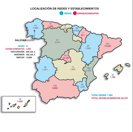 • Galicia es la quinta comunidad de España en volumen de factu-ración, número de redes y generación de empleo, por detrás de las comunidades de Madrid, Cataluña, Comunidad Valenciana y Andalucía.