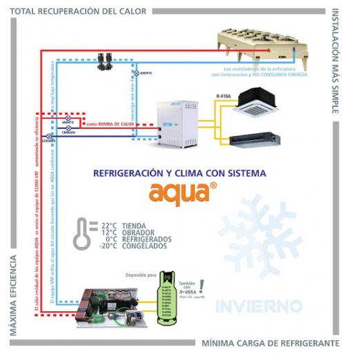 La particularidad de esta innovador solución consiste en utilizar los equipos Aqua para el control de la temperatura en servicios refrigerados y congelados, y Amazon III W para la climatización de locales y salas, ambos conectados a un mismo circuito hidráulico que dispone de una aero enfriadora para el control de la temperatura del fluido.