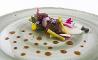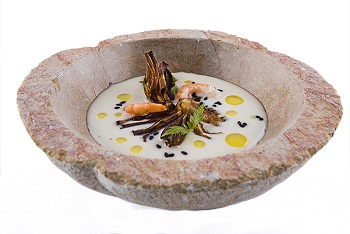 La crema del tuétano asado, fritura de alcachofa y quisquillas en un ligero salazón