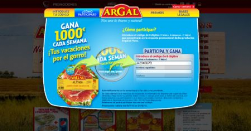 Para participar sólo deberemos introducir el código que encontraremos en los envases de Argal al Plato en el espacio dedicado a ello en la web de Argal (www.argal.com/promo) o llamar al teléfono 902 que aparece en los packs de embutidos Argal el Plato. Al momento sabremos si somos ganadores de unos de numerosos premios con los que Argal quiere alegrar el verano. Tienes tantas oportunidades para participar como productos de Argal al Plato compres y sólo hasta el 31 de Agosto del 2012.