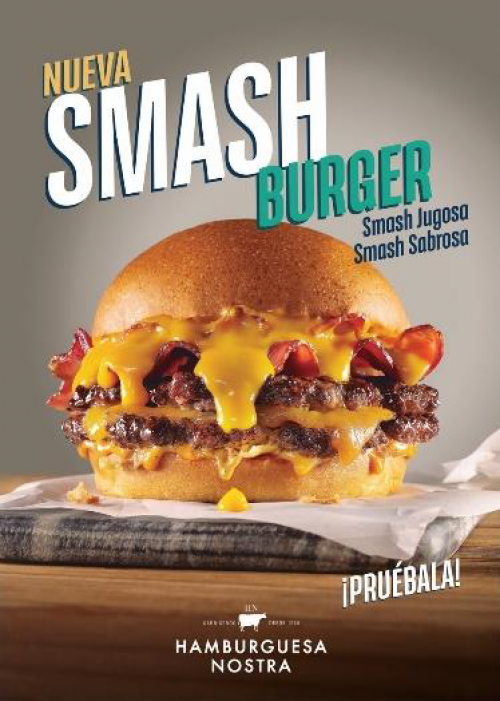 La nueva Smash Burger es una hamburguesa de dos carnes de vaca elaborada al más puro estilo americano. Con base de carne picada al estilo smash, está acompañada de queso cheddar, bacón, cebolla crujiente, salsa cheedar y salsa ahumada. Acompañada del sabroso pan brioche, la nueva Smash Burger nos devuelve a la esencia americana, ofreciendo una sencilla fórmula con productos de máxima calidad, donde el secreto está en mantener la jugosidad de la carne, convirtiéndose así en el plato estrella y más de moda esta temporada.