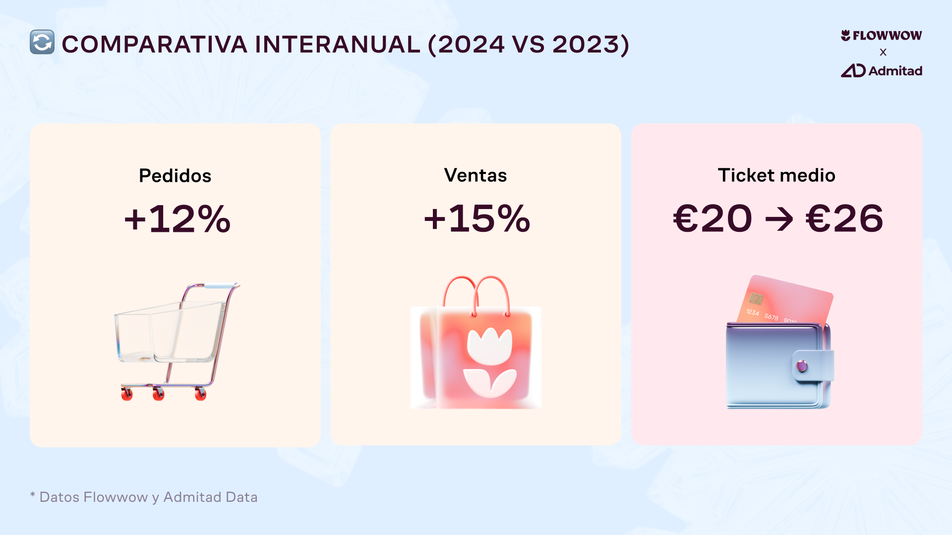 El informe de Flowwow y Admintad, que también ha analizado más de 400.000 pedidos online realizados en diciembre de 2023 y 2024, revela que las compras online registraron un crecimiento interanual entonces del 12% en número de pedidos y un 15% en volumen de ventas. El año pasado, el ticket medio por pedido se incrementó de 20 a 26 euros.