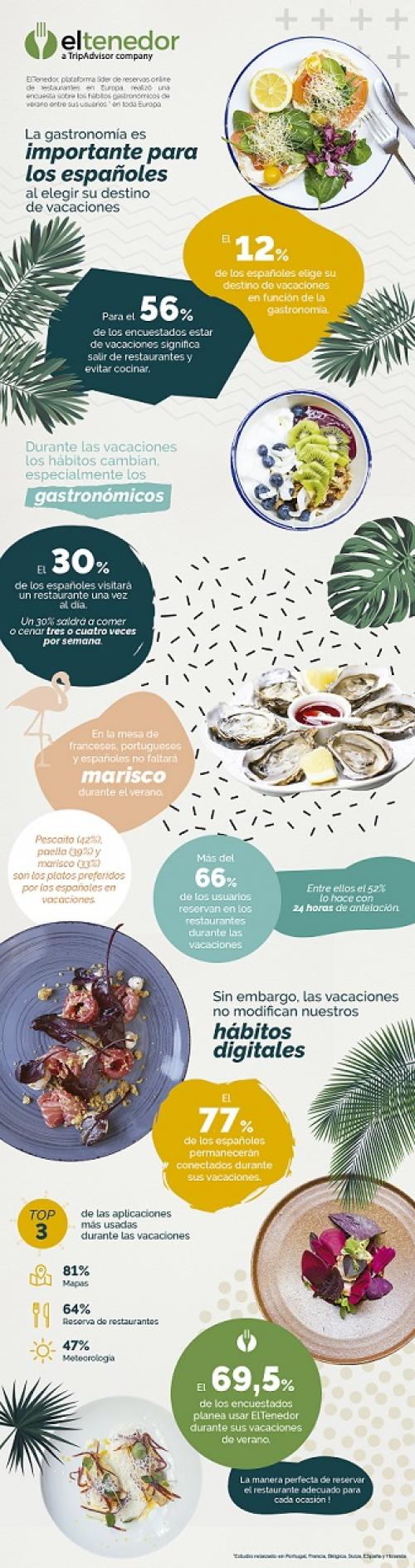 Las vacaciones están a la vuelta de la esquina y son muchos los españoles que deciden su destino en función de la gastronomía y de que allá donde vayan, haya buenos sitios para comer. De hecho, para más de la mitad de los españoles, salir de restaurantes y evitar cocinar es sinónimo de unas auténticas vacaciones. Es más, esta será una de las actividades a las que más dinero destinarán, según se desprende de un estudio elaborado por ElTenedor, la app líder de reservas online de restaurantes en Europa.