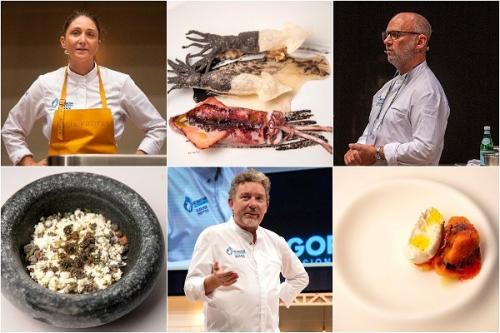 También sirve degustación Lucía Freitas, aunque la gallega no venía a hablar de ello, sino a reivindicar el sector primario femenino y gallego. La chef de A Tafona* (Santiago de Compostela) ha cocinado platos pero el colofón de su ponencia ha llegado al final, cuando ha subido al escenario a 25 gallegas y artesanas, cocineras, percebeiras, mariscadoras, artesanas, jubiladas… “Las verdaderas protagonistas de la comida de mi restaurante y del de todos. Las verdades estrellas Michelin. Las mujeres que sostienen la gastronomía de este país”. Se caía el auditorio.