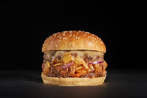 Con su explosiva mezcla de sabores y su toque rebelde, la Kevin Chingona fusiona lo mejor de la cocina mexicana con el inconfundible estilo GOIKO: carne picada a la plancha con costilla de cerdo desmenuzada, salsa barbacoa al pastor casera, cebolla morada, piña cocida, chips de nachos triturados y queso scamorza ahumado.