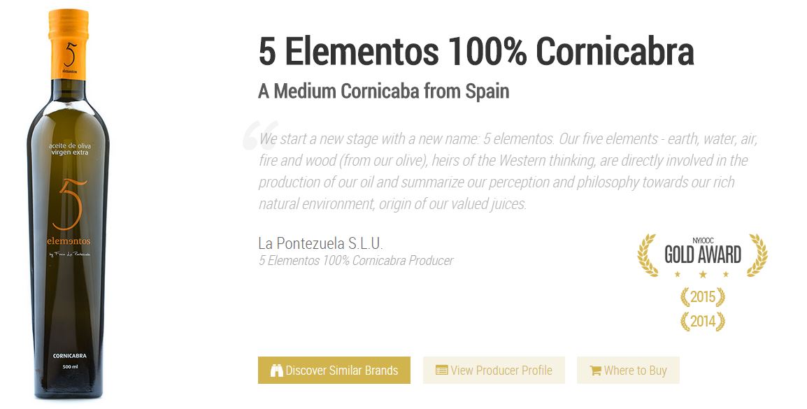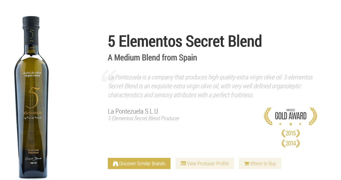 Por otra parte, “5 elementos 100% Cornicabra” y “5 elementos Secret Blend”, ganan por segundo año consecutivo sendas medallas de oro en el concurso internacional NYIOOC (New York Internacional Olive Oil Competition), que se hizo público el día 15 de abril junto con su prestigiosa conferencia sobre el virgen extra calidad.