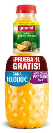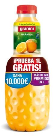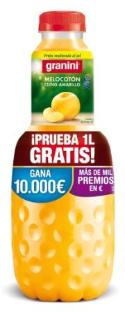 Esta temporada, granini lanza también una promoción que estará activa hasta finales de año bajo el claim ¡Prueba un litro gratis!, que permite reembolsar el importe de cualquier botella de un litro granini (excepto gama Light) a través de la página web www.prueba1litrogratis.es. Además, en las botellas de un litro de Naranja, Piña y Melocotón, también se podrá participar en otra original promoción de granini, la Ventana de la Suerte, que a través de una original ventana en el dorso de la botella desvelará, tras consumir parte del zumo, si se ha conseguido uno de los más de mil premios de granini, valorados entre los 5 y los 10.000 euros.