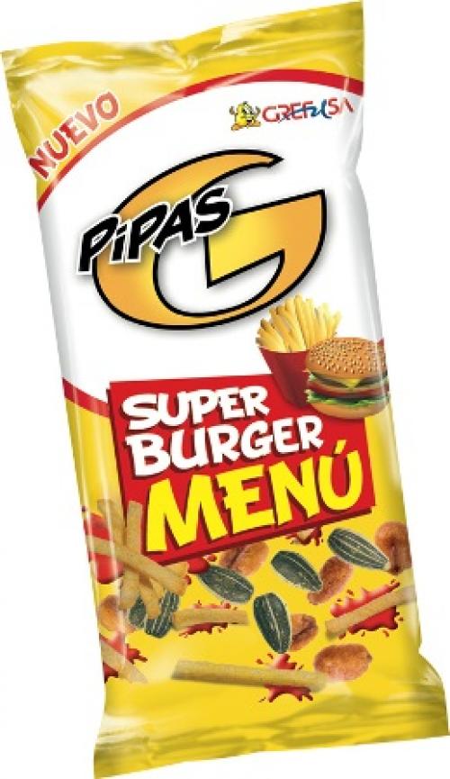 El Súper Burger Menú está compuesto por una mezcla perfecta de Pipas G sabor Big Burger, maíz MisterCorn y patatas paja súper crujientes sabor kétchup.