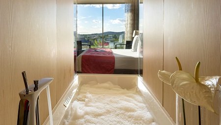 Los visitantes del Hotel MiM Sitges pueden disfrutar de la grifería monomando para baño, la teleducha 1jet EcoSmart y el mezclador monomando de bañera de pie de la colección PuraVida de hansgrohe. Además también del mezclador monomando de ducha empotrado Metris S.