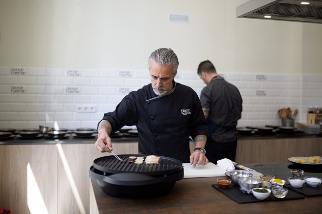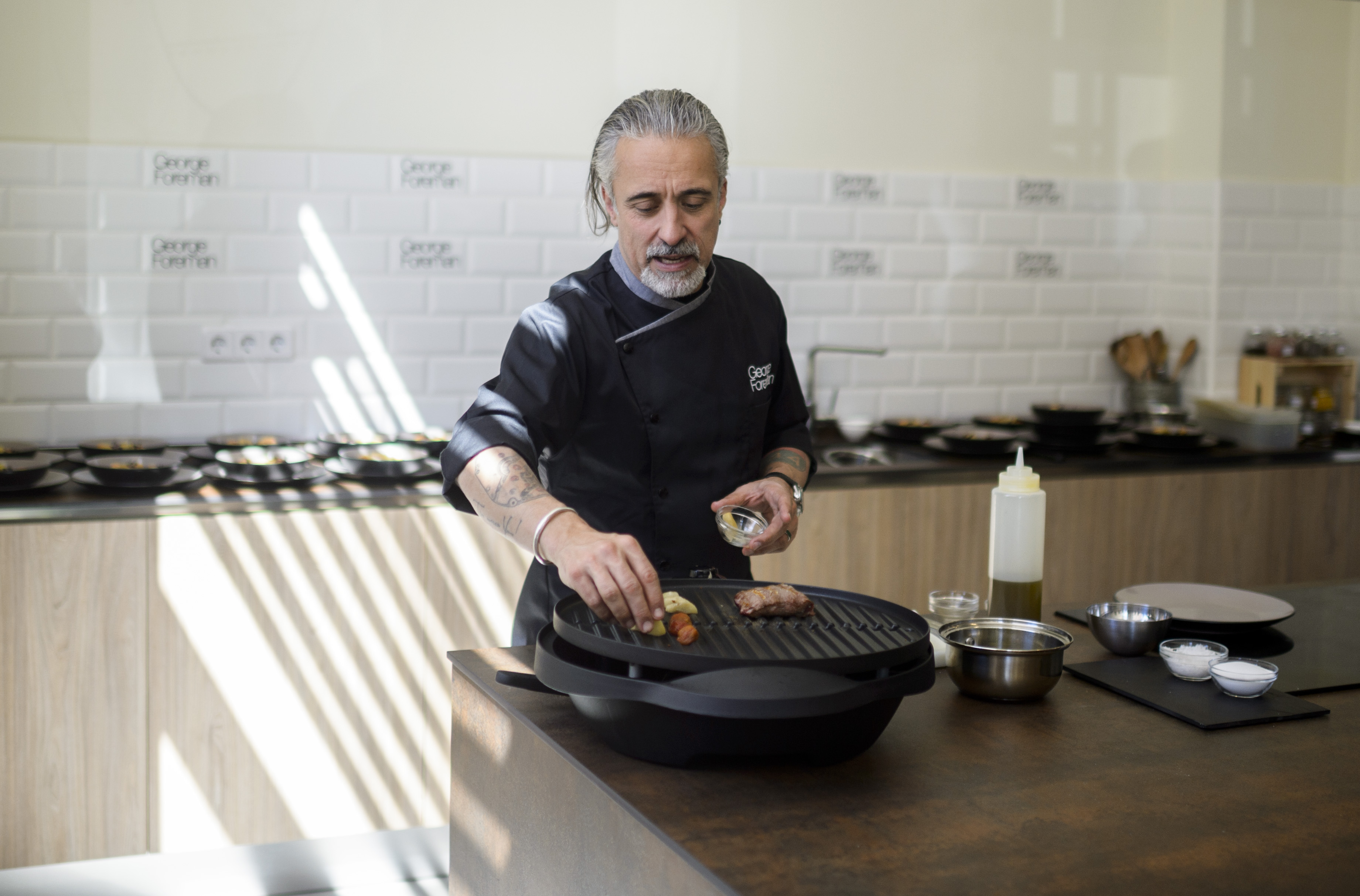 La marca de grills eléctricos George Foreman desembarca en España de la mano de la compañía Spectrum Brands, representada en el evento por el Business Unit Manager Alex Revuelta y la Directora de Marketing & Comunicación María José Barboza. La firma contó con uno de los cocineros españoles más internacionales y prestigiosos; Sergi Arola, galardonado con 2 estrellas Michelin, para su presentación. El chef, a través de un showcooking ayer en la capital, hizo una demostración del potencial de los grills, idóneos para todos aquellos que quieran llevar una dieta sana y saludable, pero siempre manteniendo la calidad sin renunciar al sabor.
