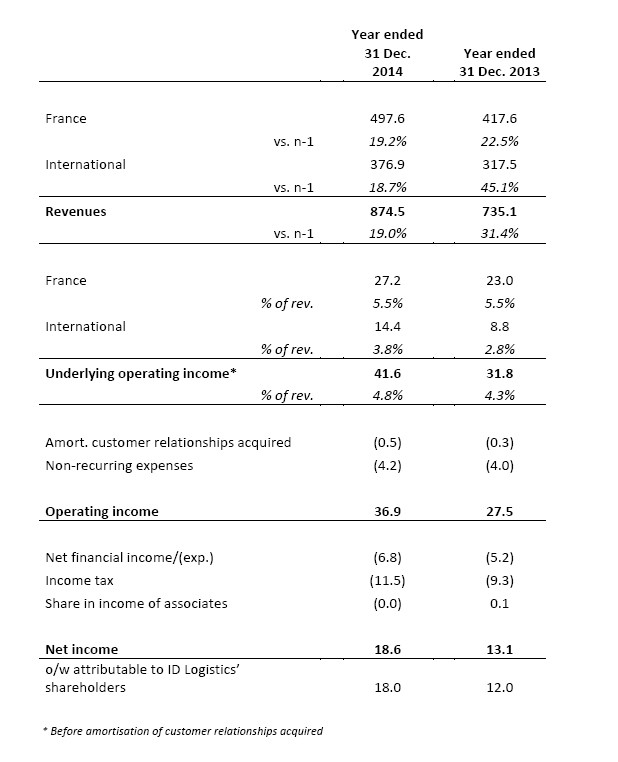 Los ingresos consolidados de ID Logistics durante 2014, alcanzaron los 874.5 millones de euros, un 19% más comparado con el año anterior. Teniendo en cuenta las perspectivas optimistas del mercado internacional, el Grupo ID Logistics mantiene un ritmo activo de crecimiento con ingresos en aumento.