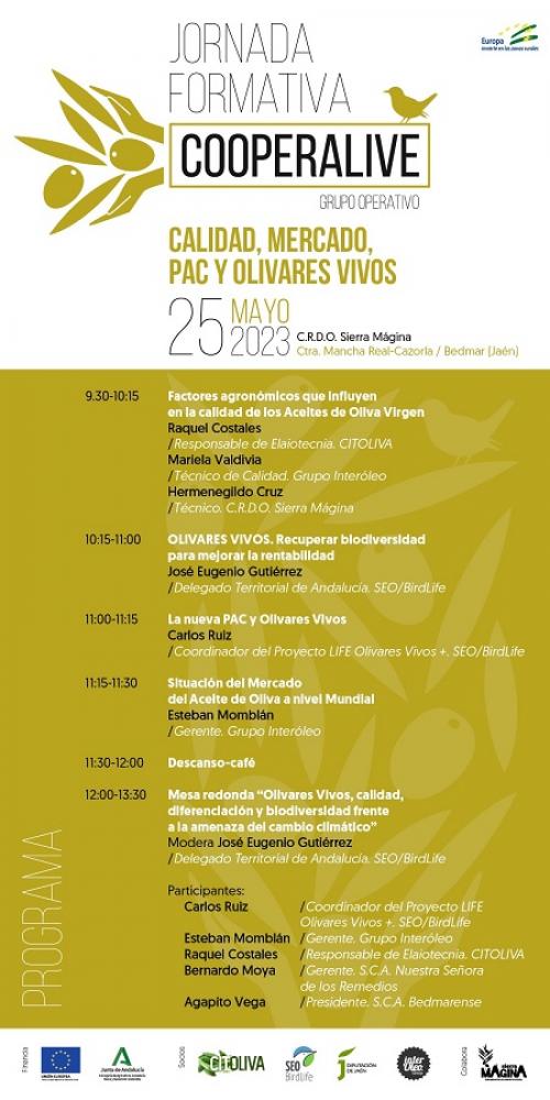 El próximo jueves 25 de mayo tendrá lugar, en la sede del C.R.D.O. Sierra Mágina (Bedmar, Jaén), la primera Jornada Formativa organizada por el Grupo Operativo Cooperalive, constituido por Citoliva, SEO Birdlife, Grupo Interóleo y la Diputación Provincial de Jaén. Está dirigida a todas las cooperativas de Andalucía interesadas en formar parte del modelo de olivicultura OLIVARES VIVOS rentable y compatible con la conservación de la biodiversidad.