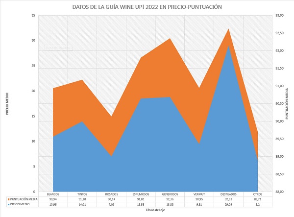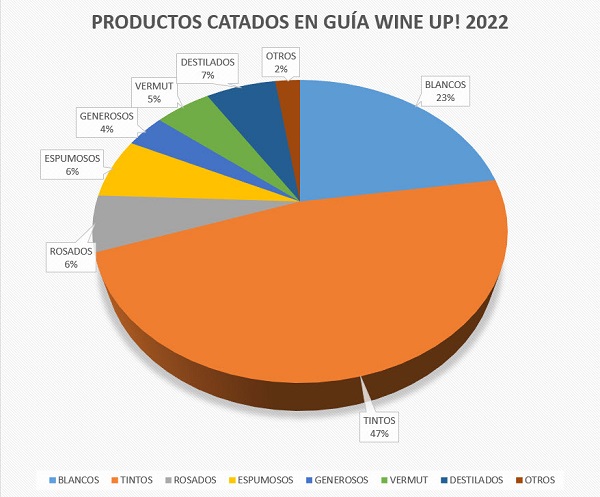 Los vinos tintos siguen teniendo el mayor protagonismo con un 47% del total, 91,08 puntos y 14,01€ de media. Los blancos suman un 23% con 90,94 puntos y 10,95€ de media. Los vinos espumosos, con un 7%, suben de valoración y precio medio hasta los 91.81 puntos y 18.55€ de media. Le siguen los vinos rosados con el 6% y 90,14 puntos y 7,02€ de media. Los vinos generosos suponen un 5% con 92.36 puntos y 18.83 € de media. Un 7% de destilados de mucha calidad que suponen 92.63 puntos y 29.09€ de media y los vermuts con el 5%, 90.95 puntos y 9.51€ de media.
