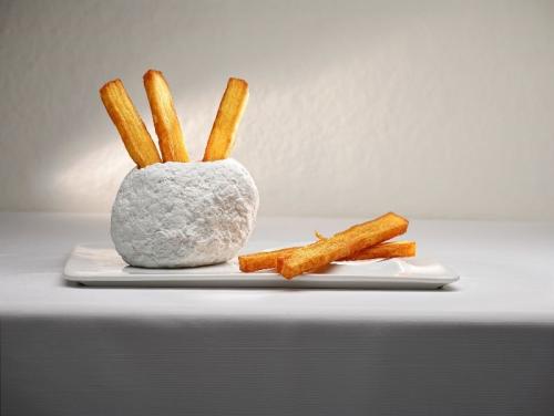Se trata de una barrita de patata semejante a un churro, de 18 centímetros, elaborada tan solo a base de patata agria gallega, aceite y sal, sin sulfitos, conservantes ni colorantes. Un aperitivo informal que sorprende por su textura y crujiente, características preservadas en su tratamiento para que el restaurador solo friendo pueda obtener unos bastones que cuando llegan a la mesa tienden a abrirse en capas mostrando un hojaldrado inverosímil, “una propuesta diferente que se puede acompañar de una salsa bearnesa, por ejemplo, así como hacerse al carbón o cubrirse con una lámina de jamón: las aplicaciones son múltiples”, explica su creador.