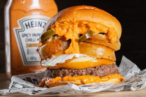 Esta hamburguesa es resultado del trabajo conjunto del equipo de ‘La H es muda’ y Cristóbal Zapico, chef ejecutivo de Heinz. La receta incluye la salsa Spicy Paprika & Chilli Mayo, una creación de Heinz para esta colaboración.