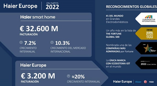 En línea con los sobresalientes resultados europeos, Haier Smart Home, la empresa matriz, ha alcanzado una facturación mundial de 243,5 billones de yuanes (RMB) (32.600 millones de euros), lo que supone un aumento superior al 7% en comparación con las cifras obtenidas durante el ejercicio anterior. A su vez, el éxito de su modelo de negocio ha sido internacionalmente reconocido con su inclusión en la lista Global 500 y World’s Most Admired Companies de la revista Fortune y en la lista BrandZ Top 100 Most Valuable Brands como única marca del ecosistema IoT.